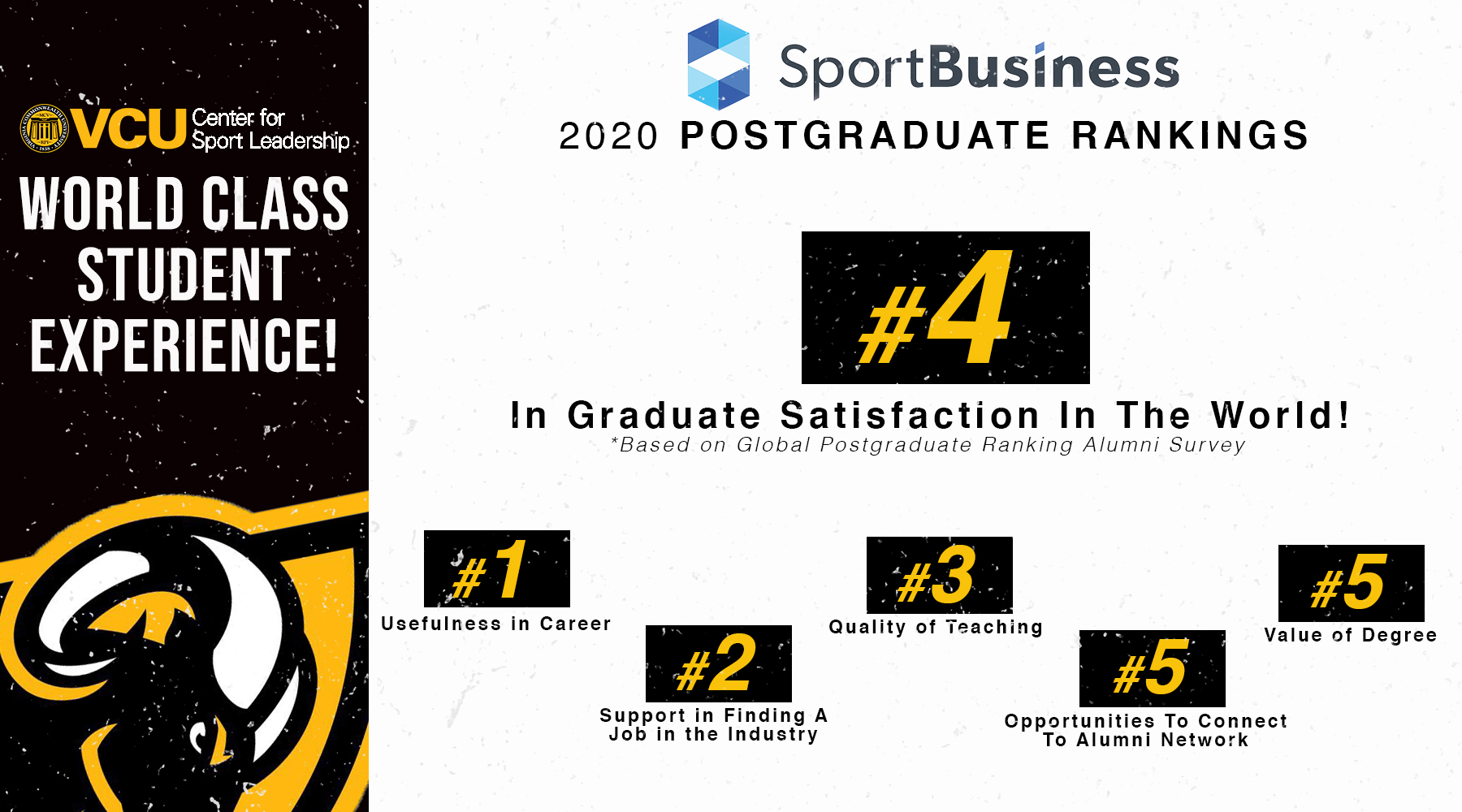 Following another banner year for the program, the VCU Center for Sport Leadership has been ranked 12th worldwide and 9th in North America in the 2020 SportBusiness Postgraduate Course Rankings. The CSL received multiple votes from its peers as one of the top sports management programs in the world and was named the 4th-best program worldwide in the Graduates Choice category for the second consecutive year.