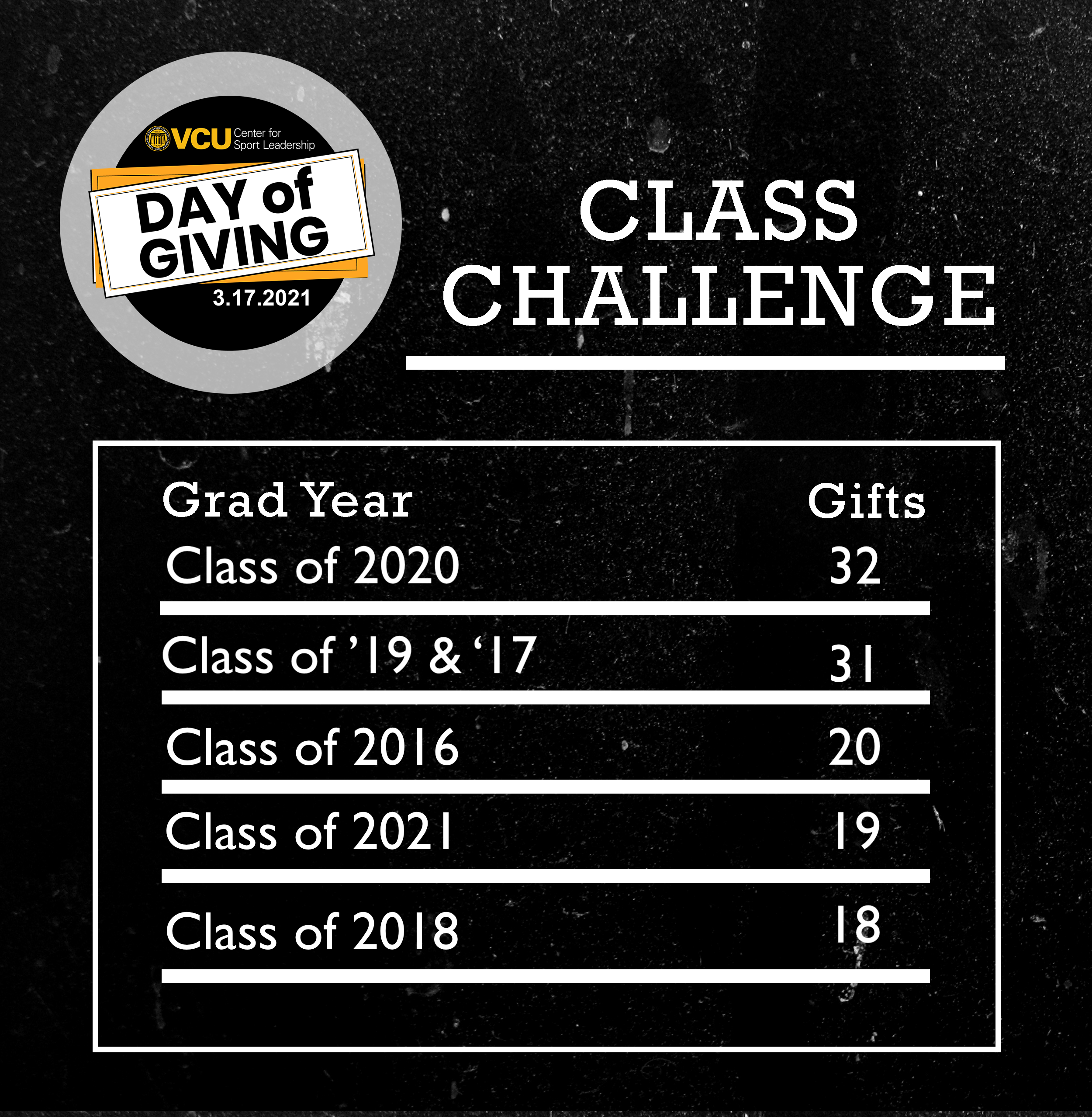 The Class Challenge was won by graduates from the Class of 2020 with 32 gifts.