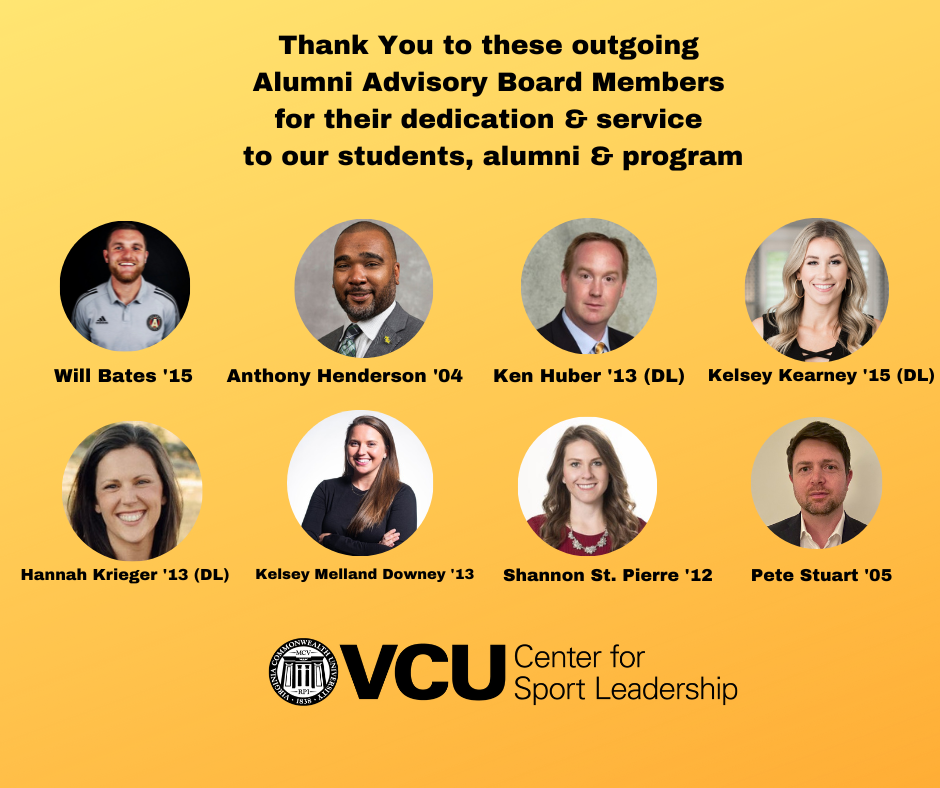 VCU Center for Sport Leadership welcomed nine new members to the Alumni Advisory Board replacing the outgoing board members whose terms came to an end this summer.
